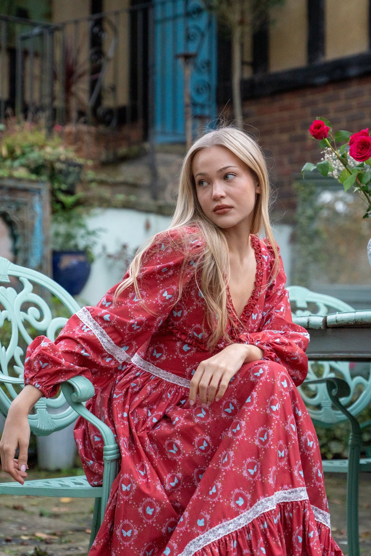 A dress spun from soft daydreams and gardens, Flutter Lace Bloom Maxi Dress invites you into a world where butterflies dance in the golden hush of afternoon light. With its elegant silhouette featuring a romantic deep V neckline, full-length poet sleeves, and a sweeping tiered skirt, this piece is both nostalgic and fresh. Crafted from breathable cotton and adorned with our exclusive "Butterflies in Bloom" print, it carries a feeling of quiet poetry. Delicate ruffle trims frame the neckline and skirt, adding texture and whimsy to each step. Wherever you take it, this dress tells a story of grace in motion.