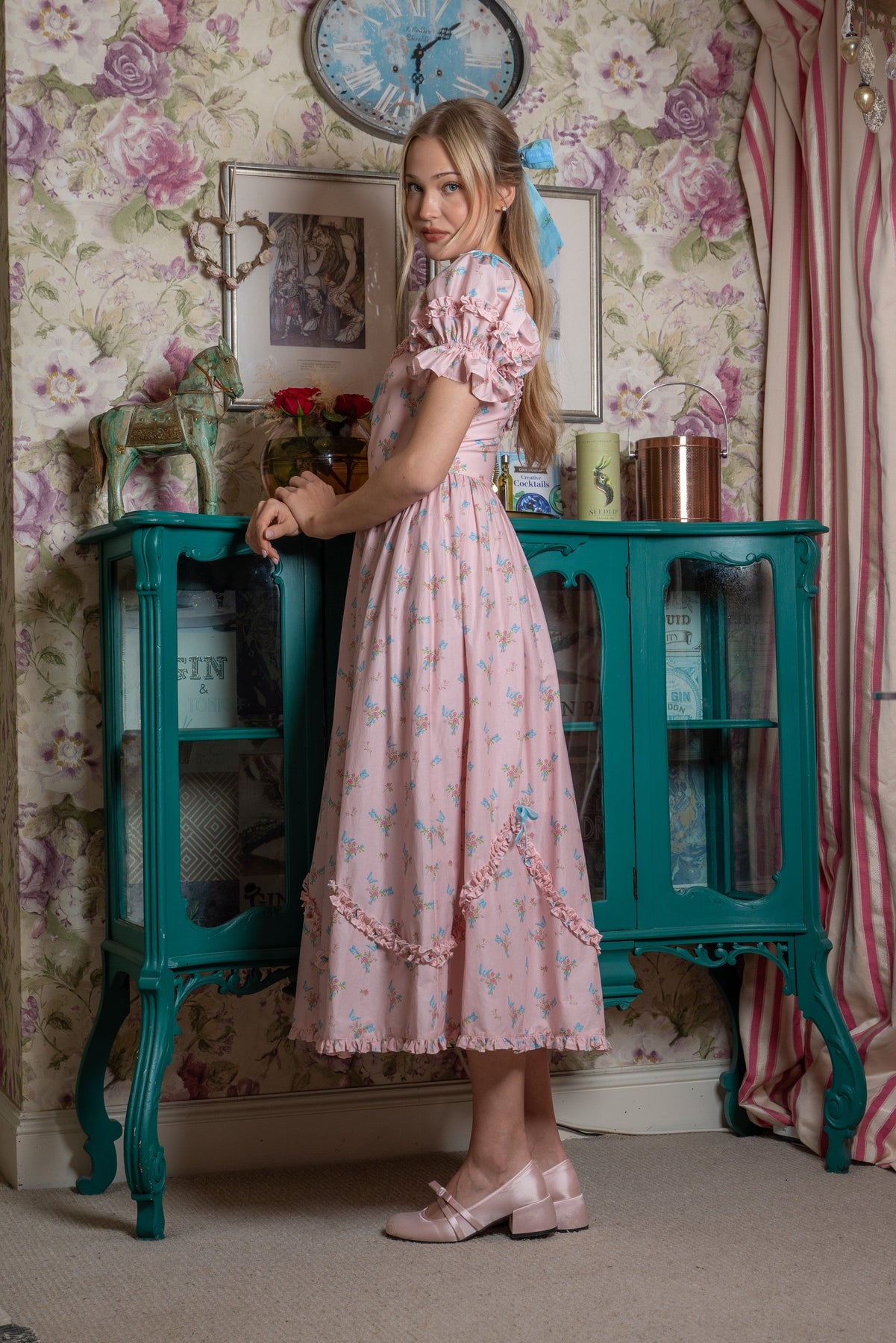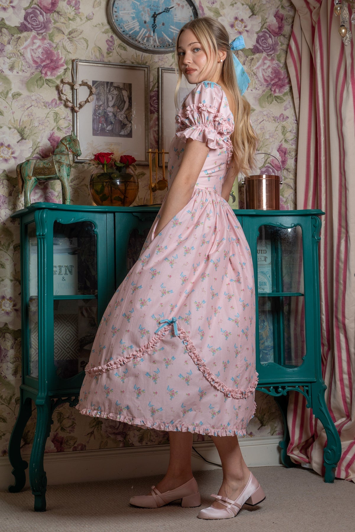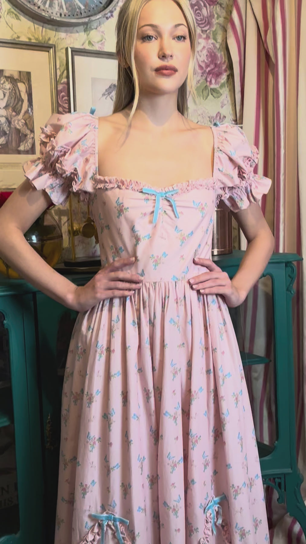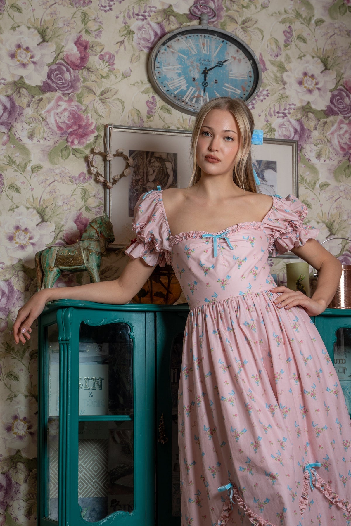 Delicate puff sleeves with fluttering ruffles frame a romantic sweetheart neckline trimmed in frills, while handmade velvet bows are lovingly handsewn onto the bodice and skirt — a touch of fairytale craftsmanship in every stitch. The flared, ruffled skirt sways with movement and hides invisible side pockets, because even dreamers need a place to keep their treasures. Step into the garden of your own story, and let your wings unfold.
