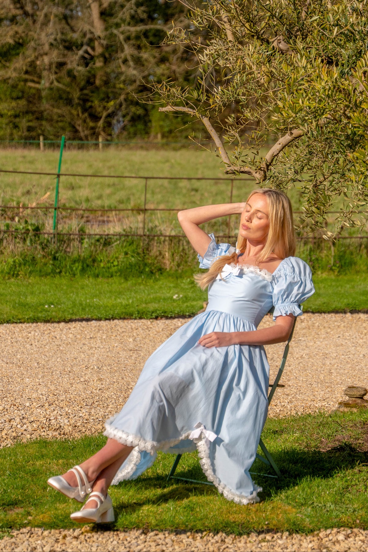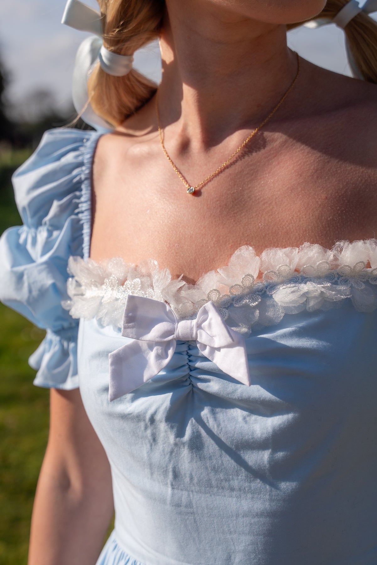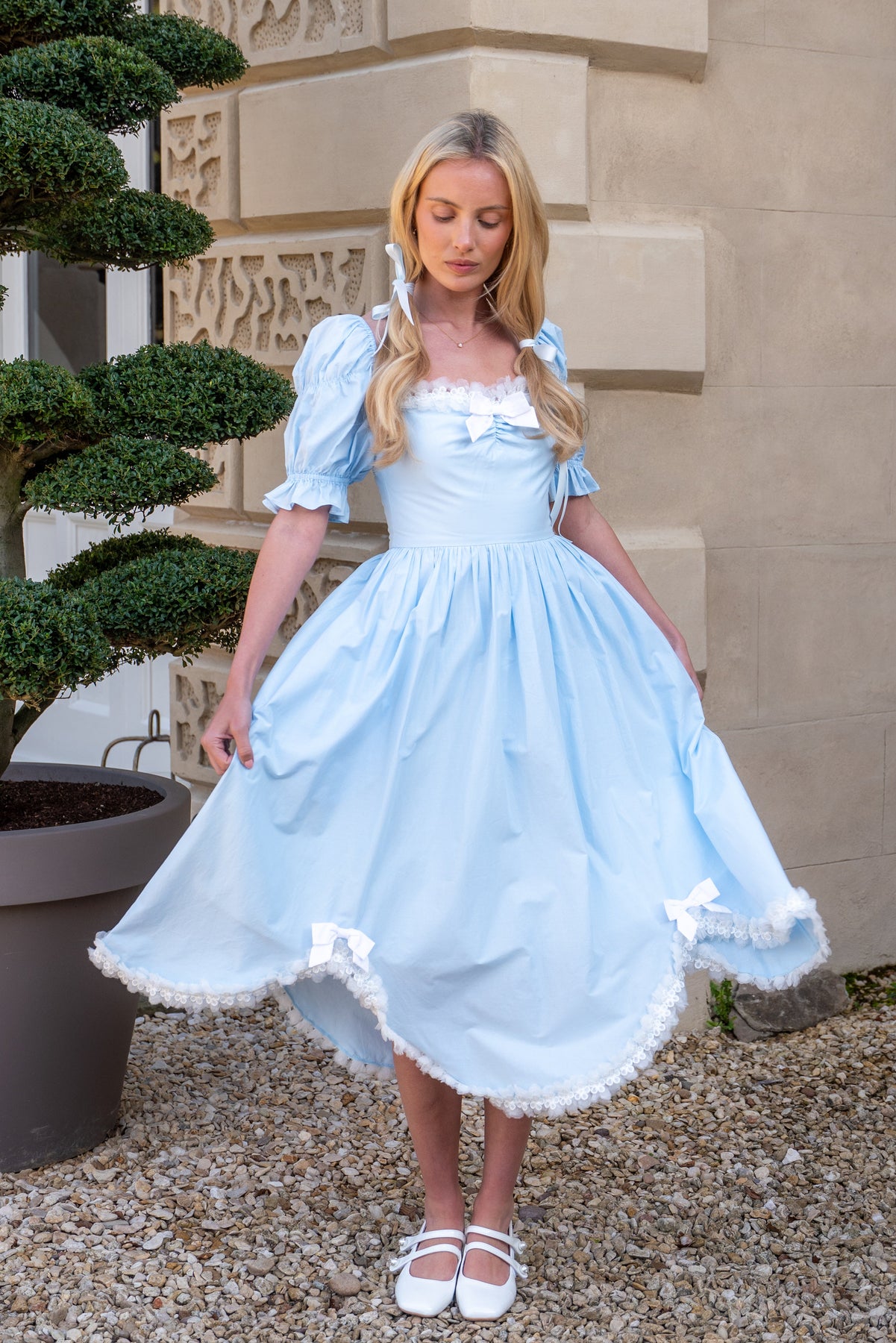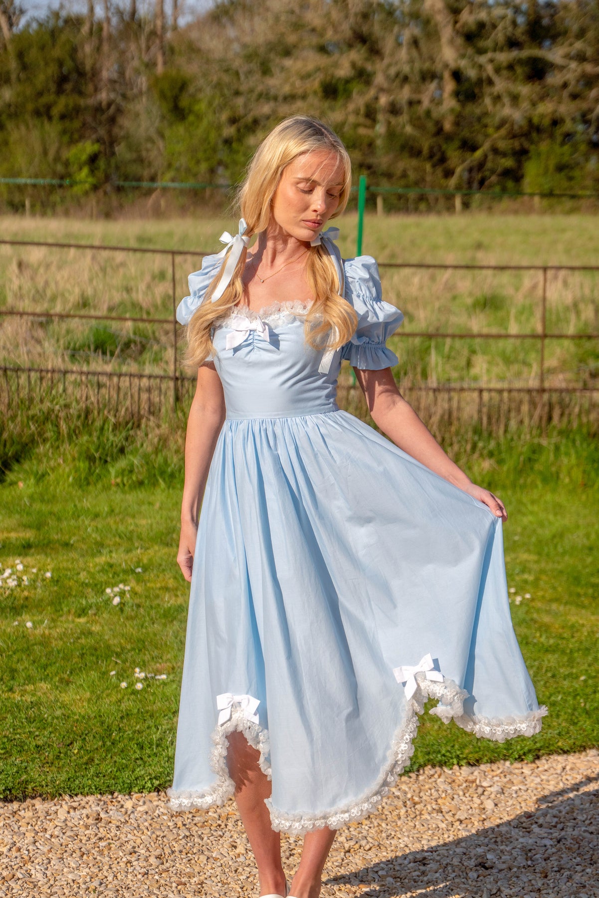 Puff sleeves add a touch of volume, while the flowing skirt falls into a petal-shape hem edged with lace and finished with ribbon bows that sway with every step. Comfortable, girly, and easy to wear, this piece is made for sunlit afternoons, café moments, and days that call for something softly beautiful.