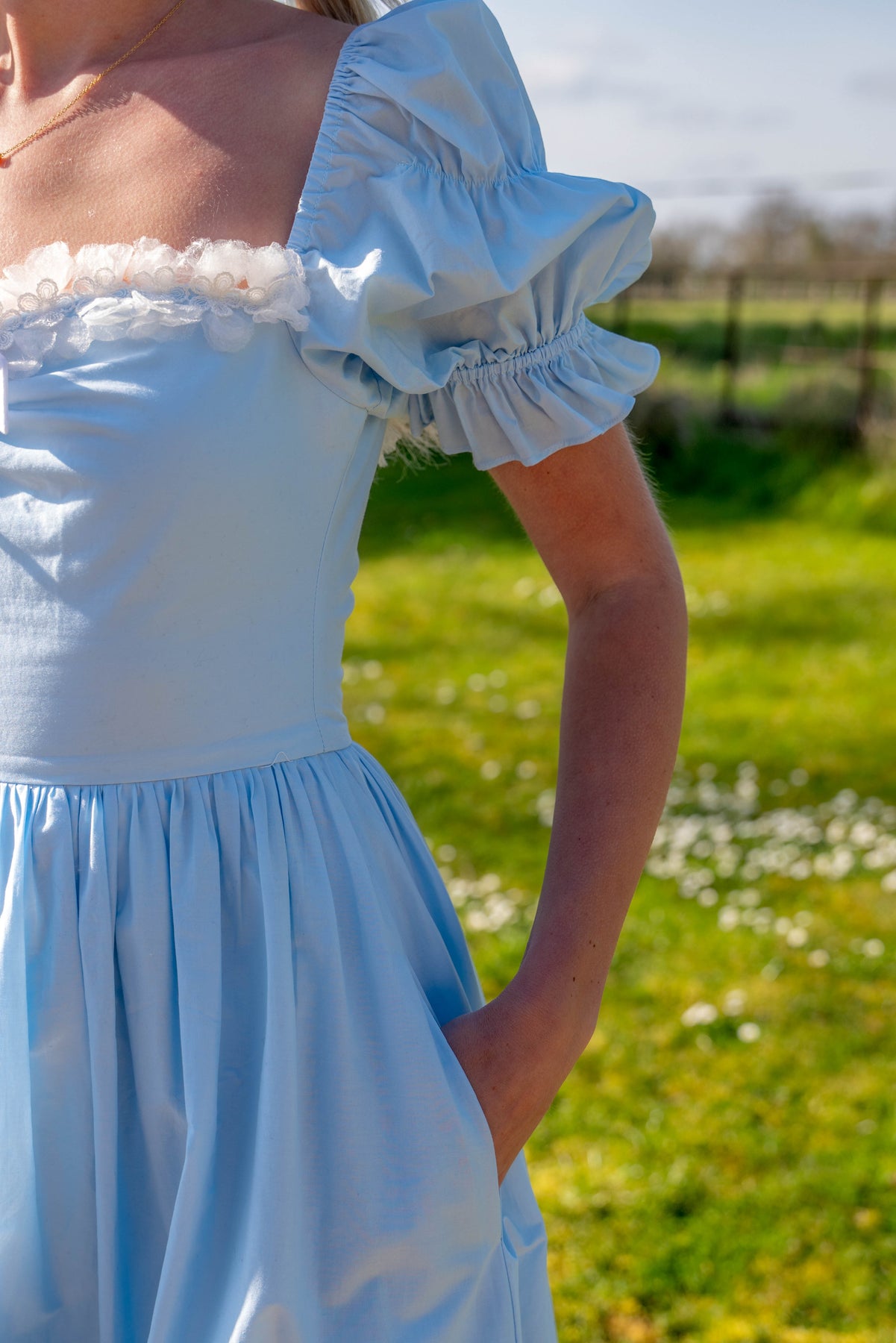 Light as air and soft as a summer sky, the Alice's Garden Midi Dress is a gentle ode to simplicity and charm. Crafted from breathable cotton in a serene sky blue hue, it brings an effortless elegance to everyday dressing. The softly ruched bodice is framed by delicate floral lace trim and finished with a dainty bow at the neckline — a quiet detail that feels both playful and refined.