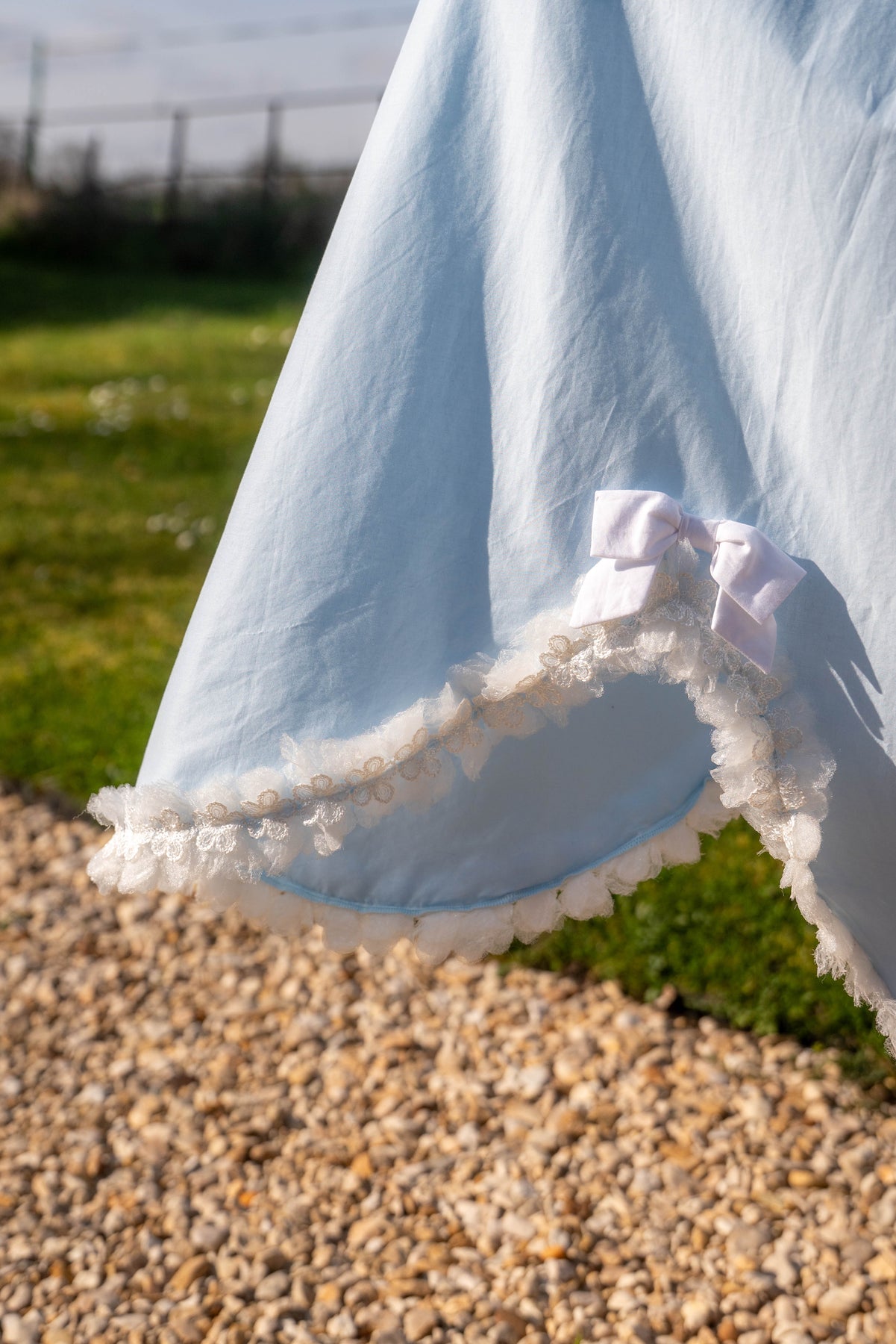 • Handmade bows at the neckline and along the hem
