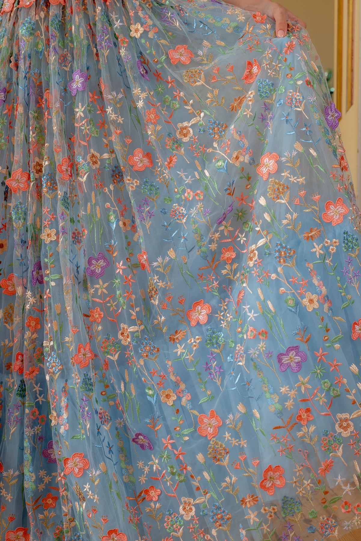 • Blue tulle with multicolour 3D floral embroidery