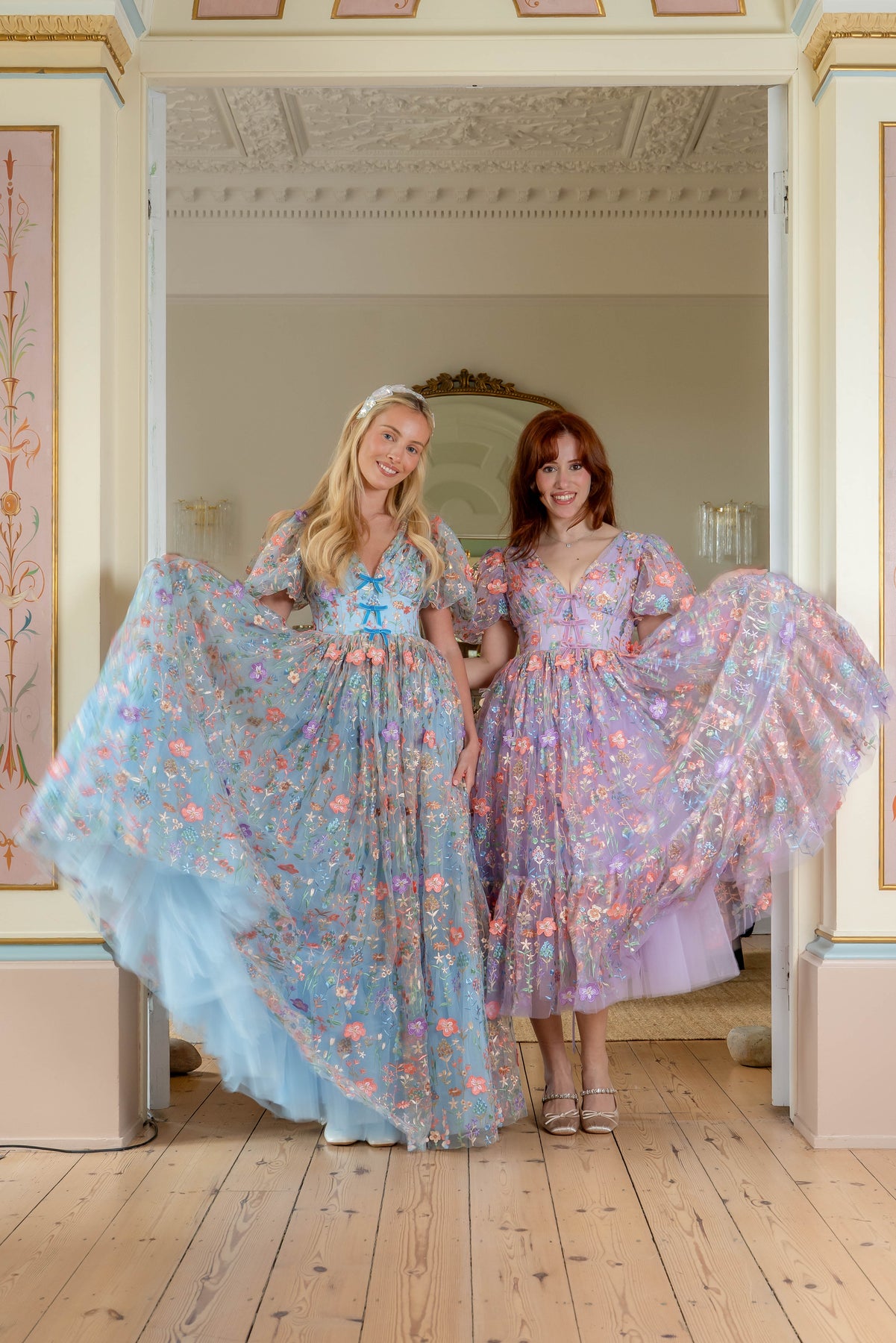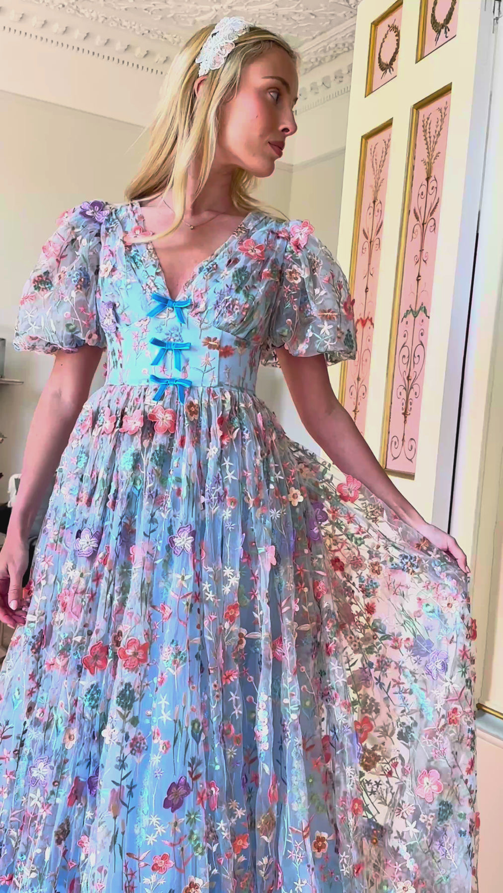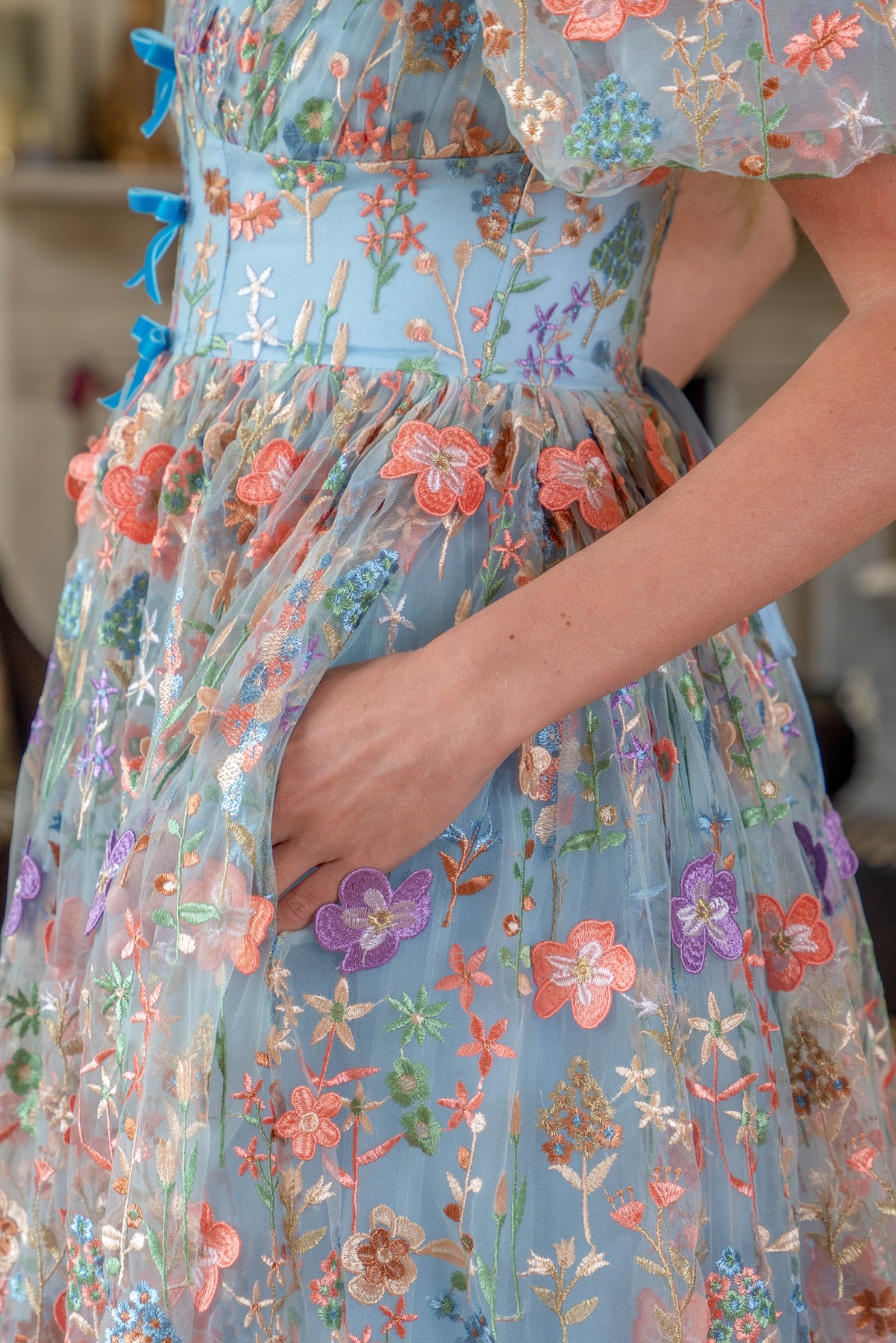 Like a meadow caught between sky and earth, the Enchanted Meadow Gown blooms in layers of blue tulle, scattered with intricate 3D embroidered florals that feel alive with movement. Each thread traces delicate wildflowers in full bloom, creating a tapestry of colour that shifts gently with every step. The ruched bodice is framed by voluminous puff sleeves, adding a romantic softness, while delicate bow accents at the centre bring a touch of playful charm. The silhouette flows into a full-length skirt, where sheer embroidered layers drift effortlessly, like petals carried on a quiet breeze.