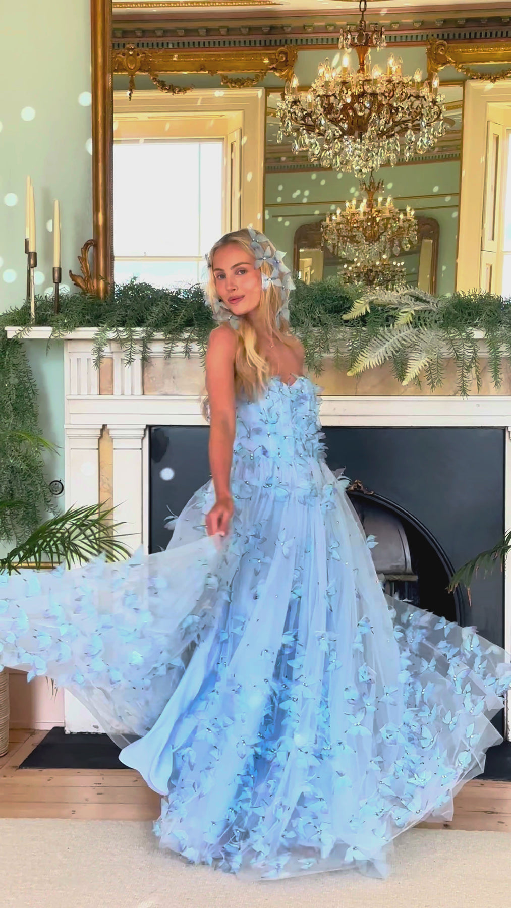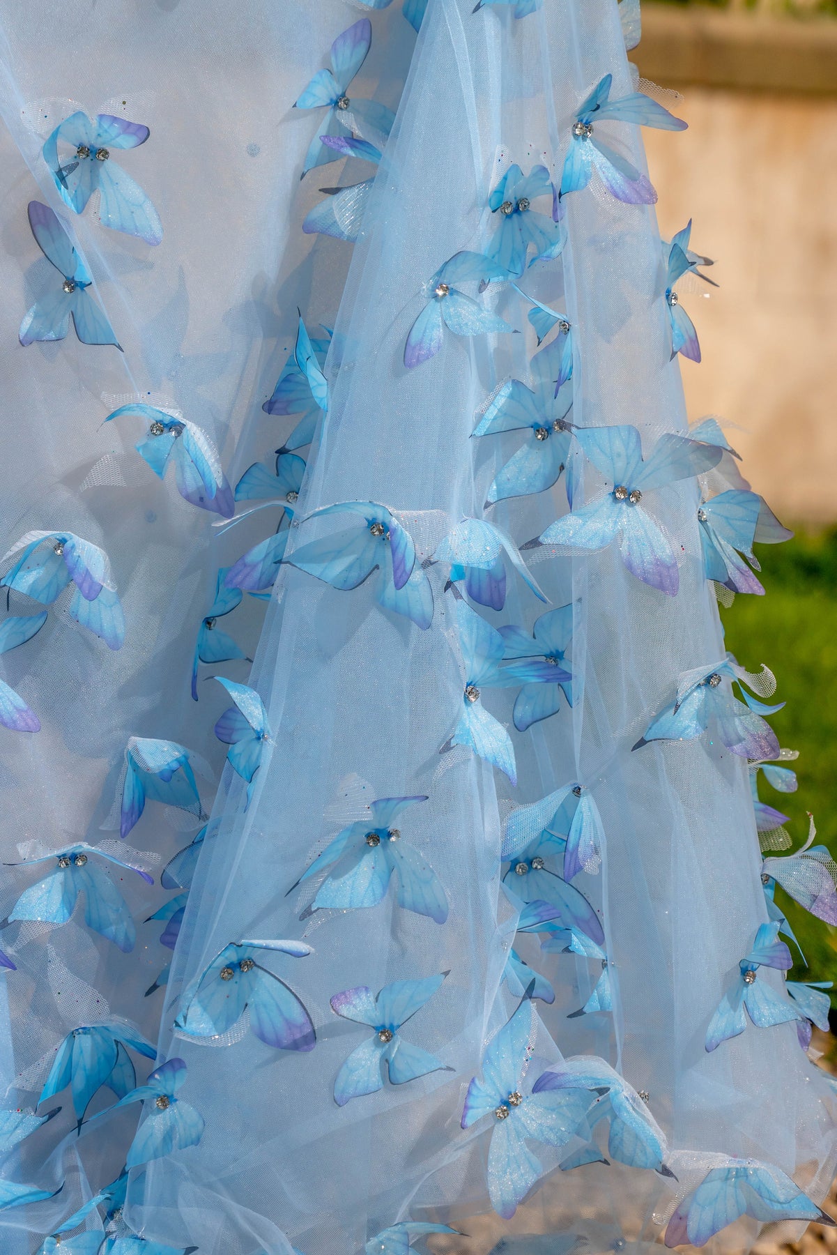 • Layers of crystal blue tulle with 3D crystal butterfly appliqué