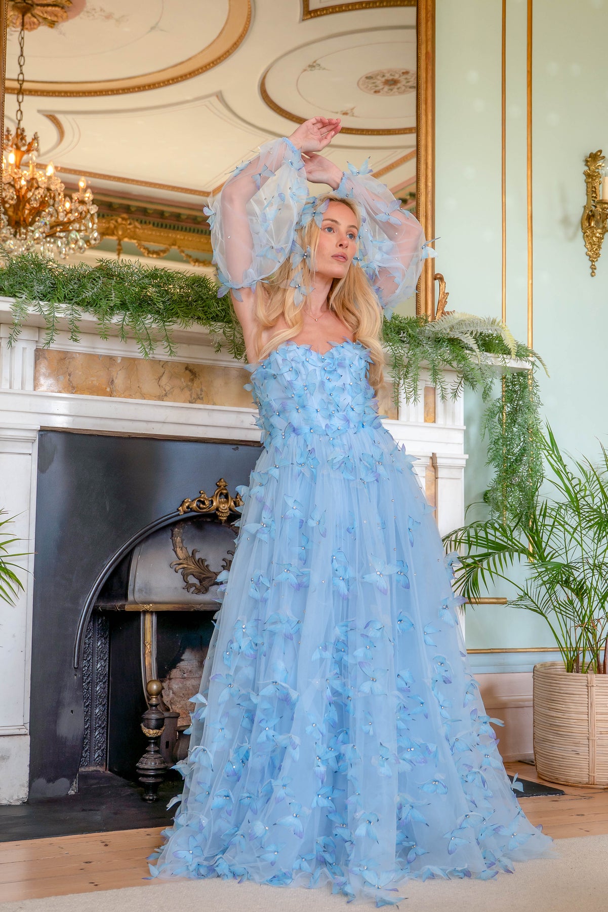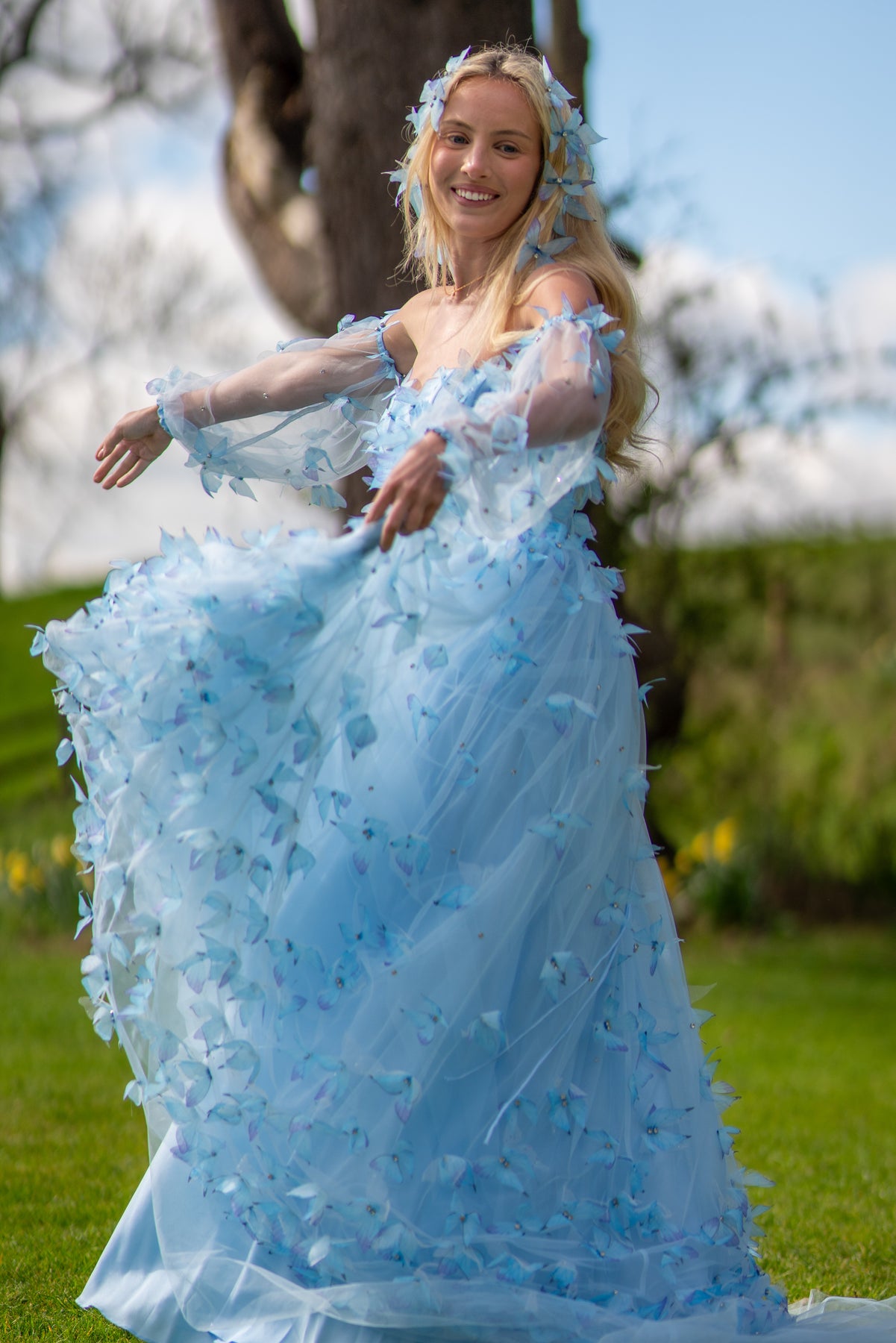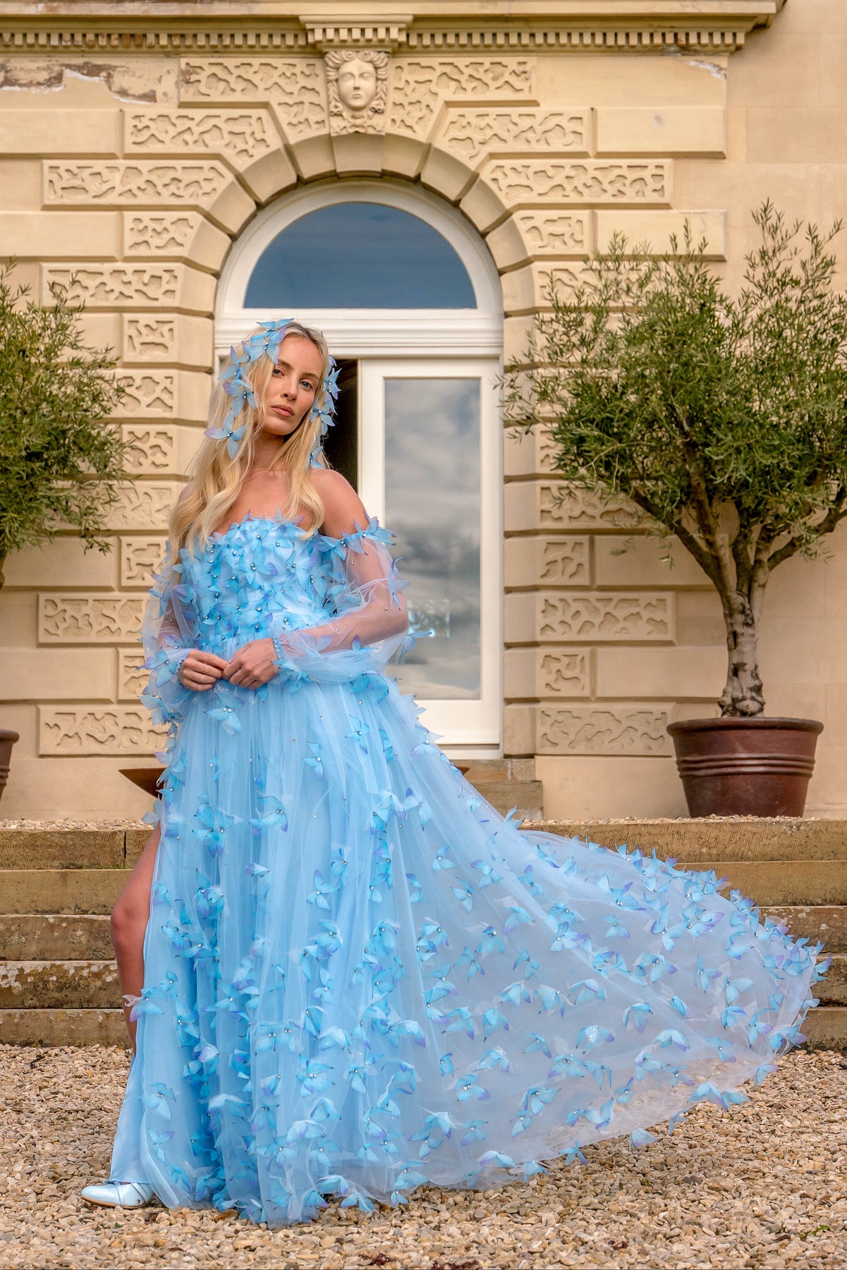 Ethereal and weightless, the Morpho Fairytale Gown feels like a sky filled with wings in flight. Crafted from layers of airy crystal blue tulle, the silhouette is adorned with delicate 3D crystal butterflies, each one hand-placed to create the illusion of movement — as if they’ve just lifted into the air. The structured bodice is softly sculpted, leading into a flowing skirt that extends into a rounded train, trailing behind like a whisper.